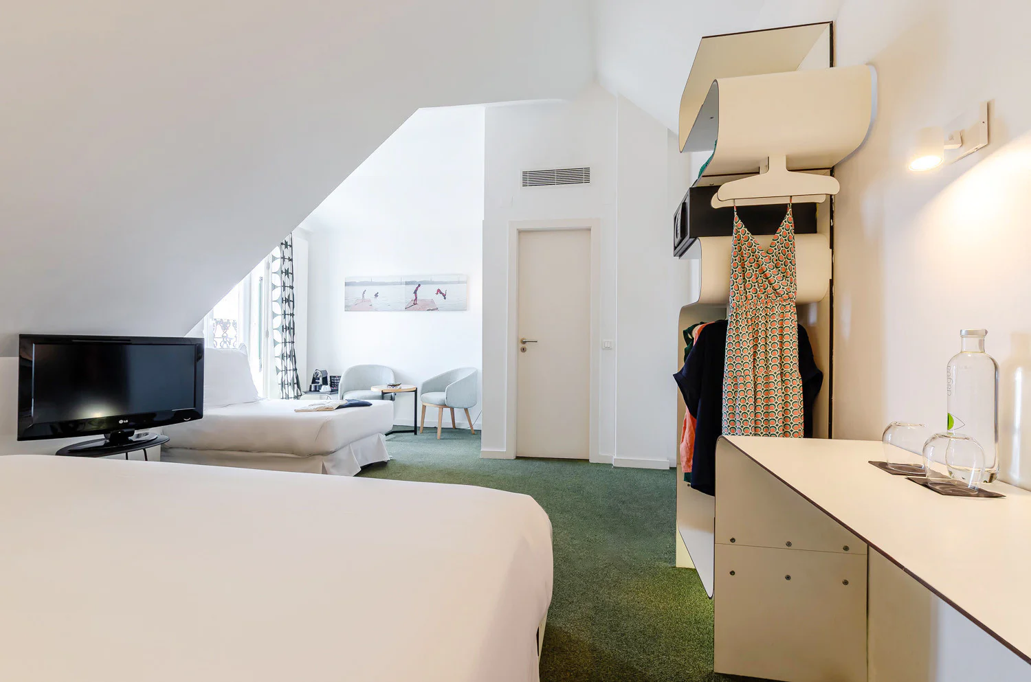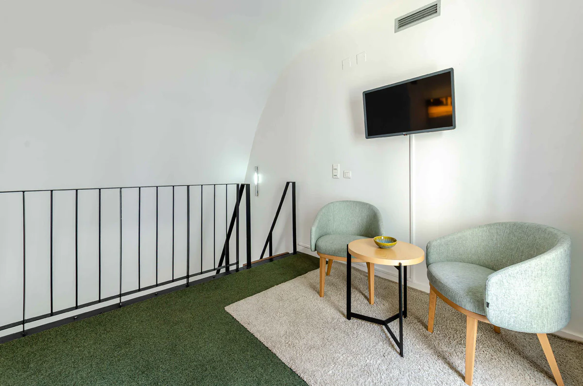 Nuestra habitación más amplia tiene su propia sala de estar y sitio de sobra para que cada uno tenga su zona de relax. Prepárate un café y recarga energía para todo lo que quieres hacer en la ciudad.